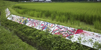 "Approximately 400 painted plywood panels are placed along the gutters of rice paddy fields. Grass and flowers poke out through numerous holes in the panels [The exhibit lasted 3 months]. The work conveys the strength of nature’s life force against the backdrop of the artificial colors of the panels."